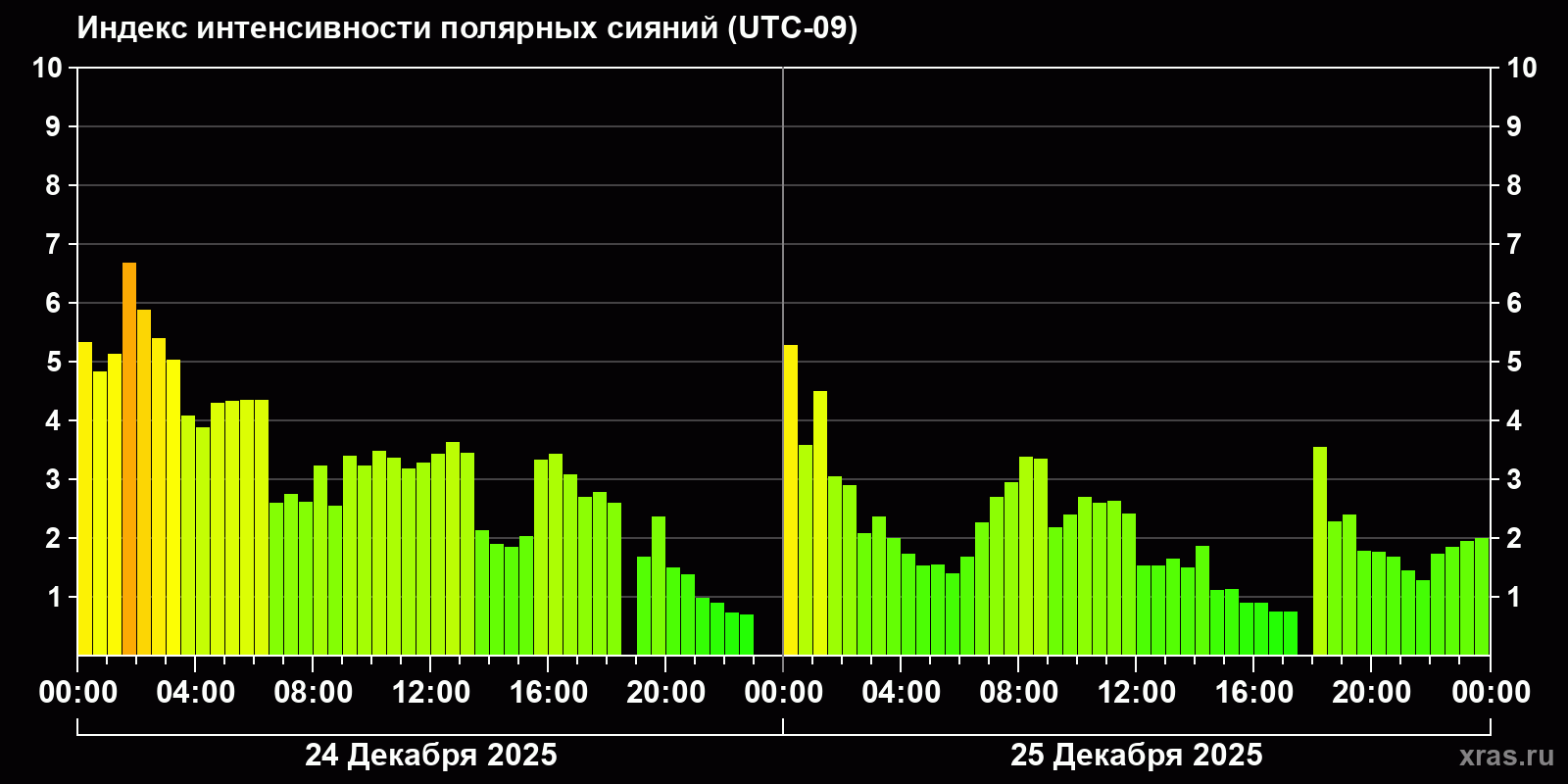 Изменения индекса интенсивности полярных сияний с 2025-12-24 по 2025-12-25 по местному времени