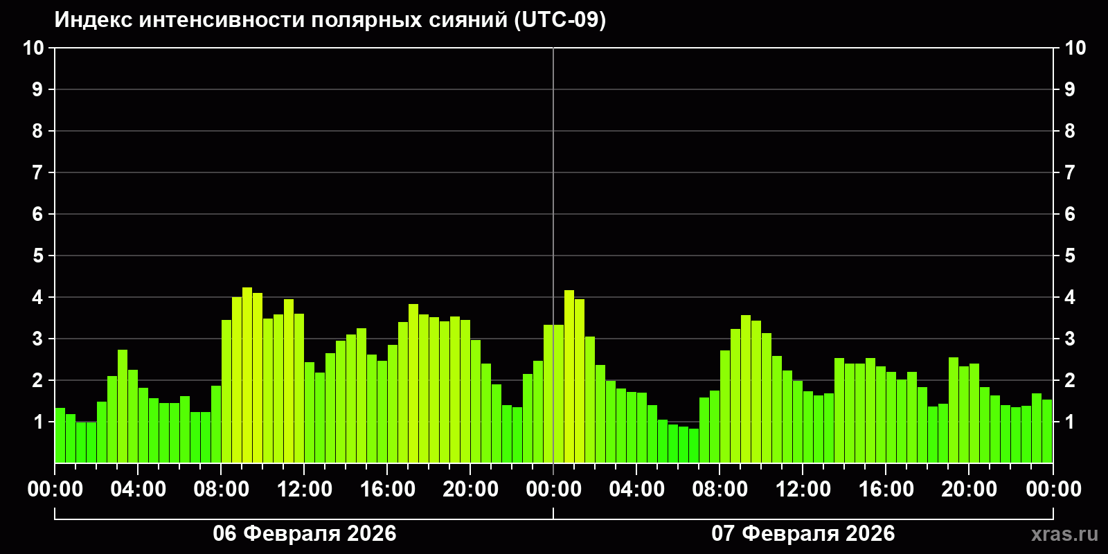 Изменения индекса интенсивности полярных сияний с 2026-02-06 по 2026-02-07 по местному времени