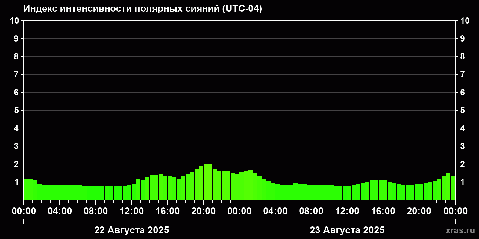 Изменения индекса интенсивности полярных сияний с 2025-08-22 по 2025-08-23 по местному времени