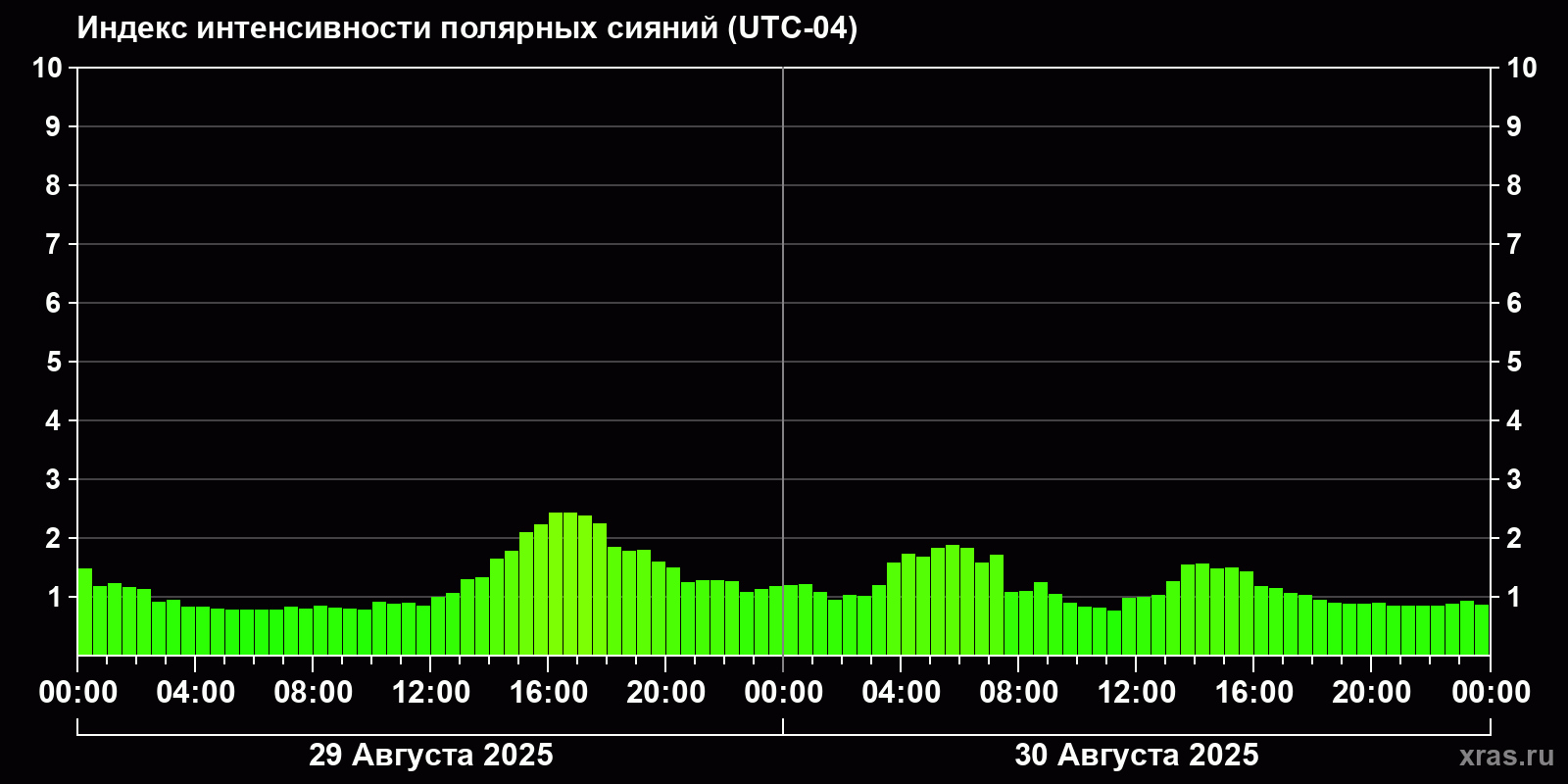 Изменения индекса интенсивности полярных сияний с 2025-08-29 по 2025-08-30 по местному времени