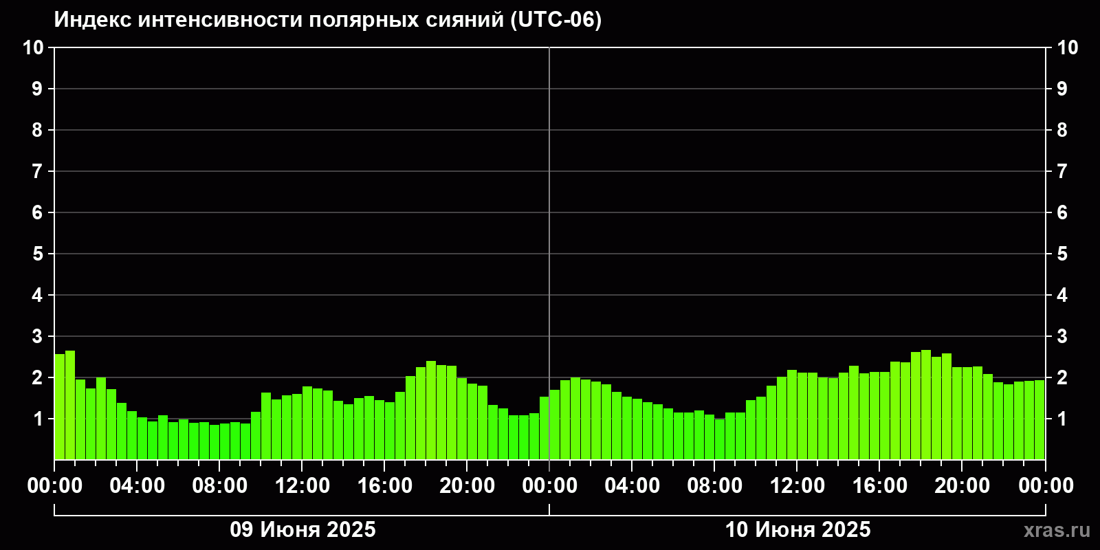 Изменения индекса интенсивности полярных сияний с 2025-06-09 по 2025-06-10 по местному времени