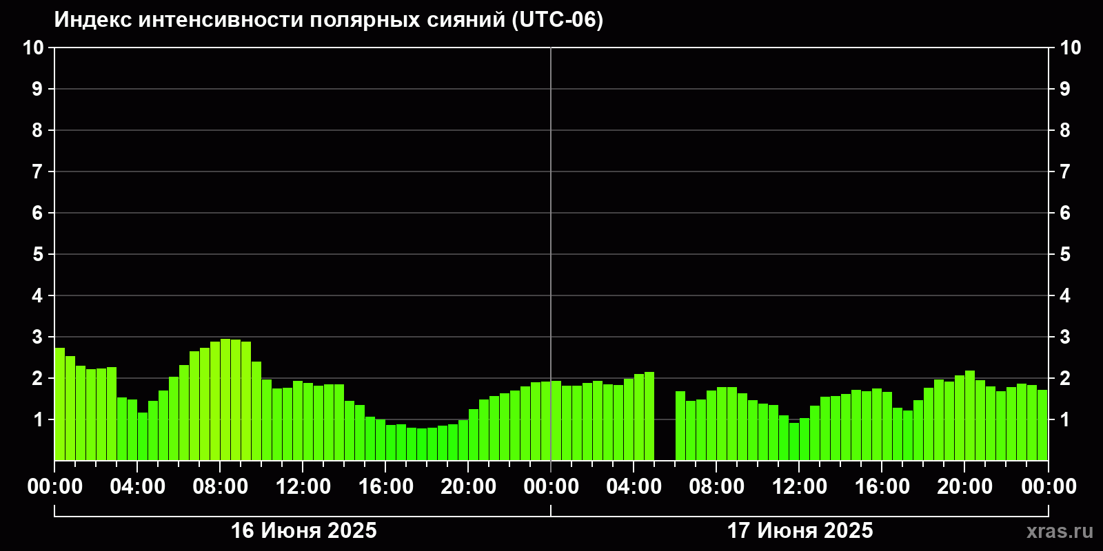 Изменения индекса интенсивности полярных сияний с 2025-06-16 по 2025-06-17 по местному времени