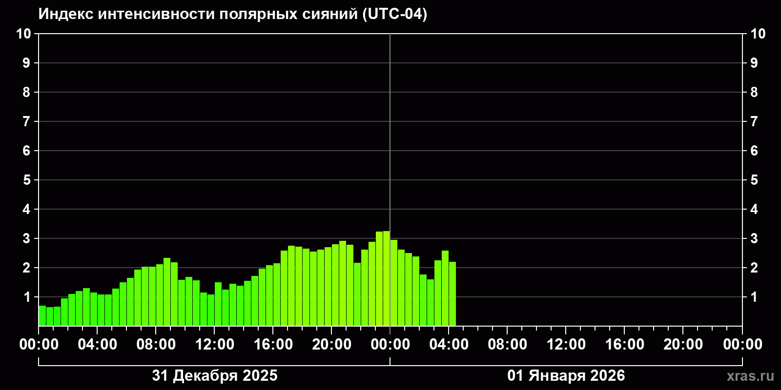Изменения индекса интенсивности полярных сияний с 2025-12-31 по 2026-01-01 по местному времени