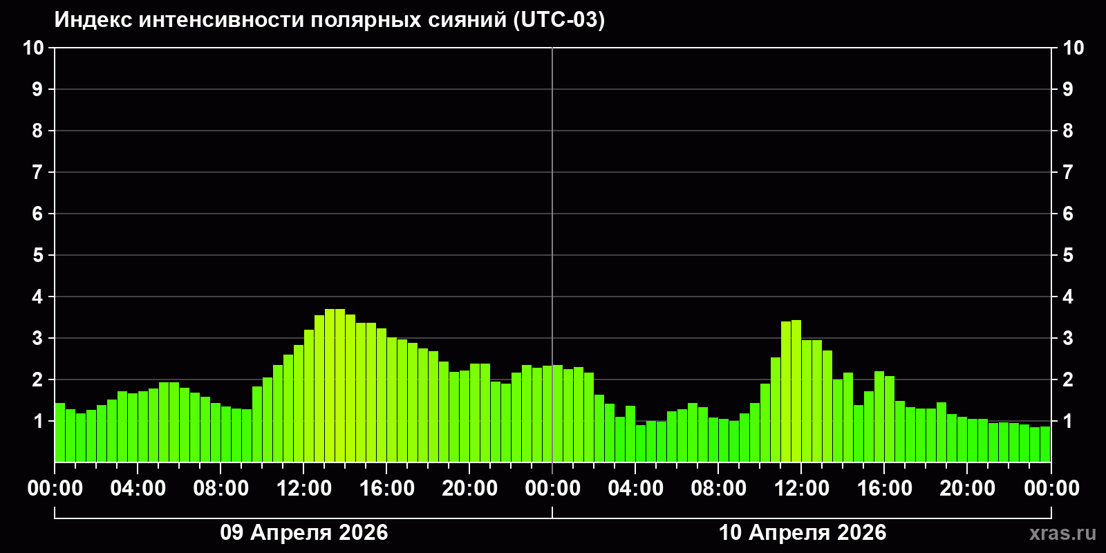 Изменения индекса интенсивности полярных сияний с 2026-04-09 по 2026-04-10 по местному времени