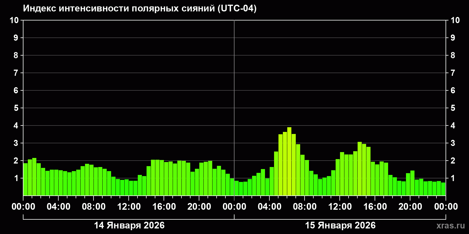 Изменения индекса интенсивности полярных сияний с 2026-01-14 по 2026-01-15 по местному времени