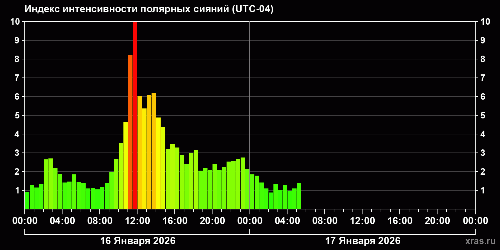 Изменения индекса интенсивности полярных сияний с 2026-01-16 по 2026-01-17 по местному времени
