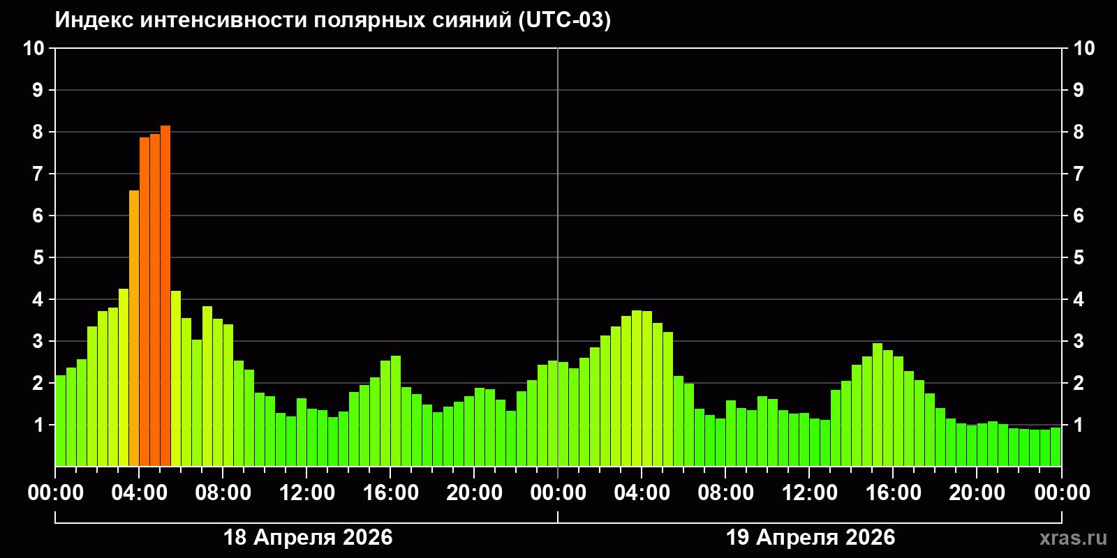 Изменения индекса интенсивности полярных сияний с 2026-04-18 по 2026-04-19 по местному времени