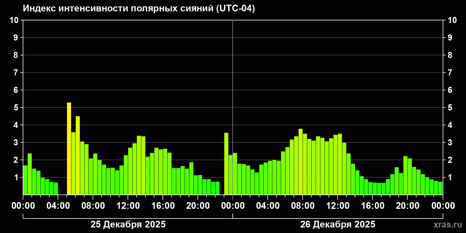 Изменения индекса интенсивности полярных сияний с 2025-12-25 по 2025-12-26 по местному времени