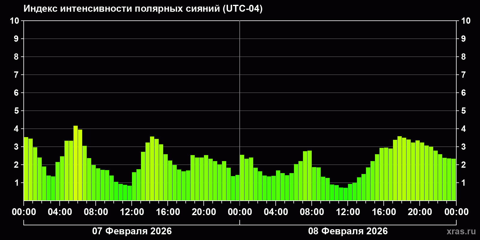 Изменения индекса интенсивности полярных сияний с 2026-02-07 по 2026-02-08 по местному времени