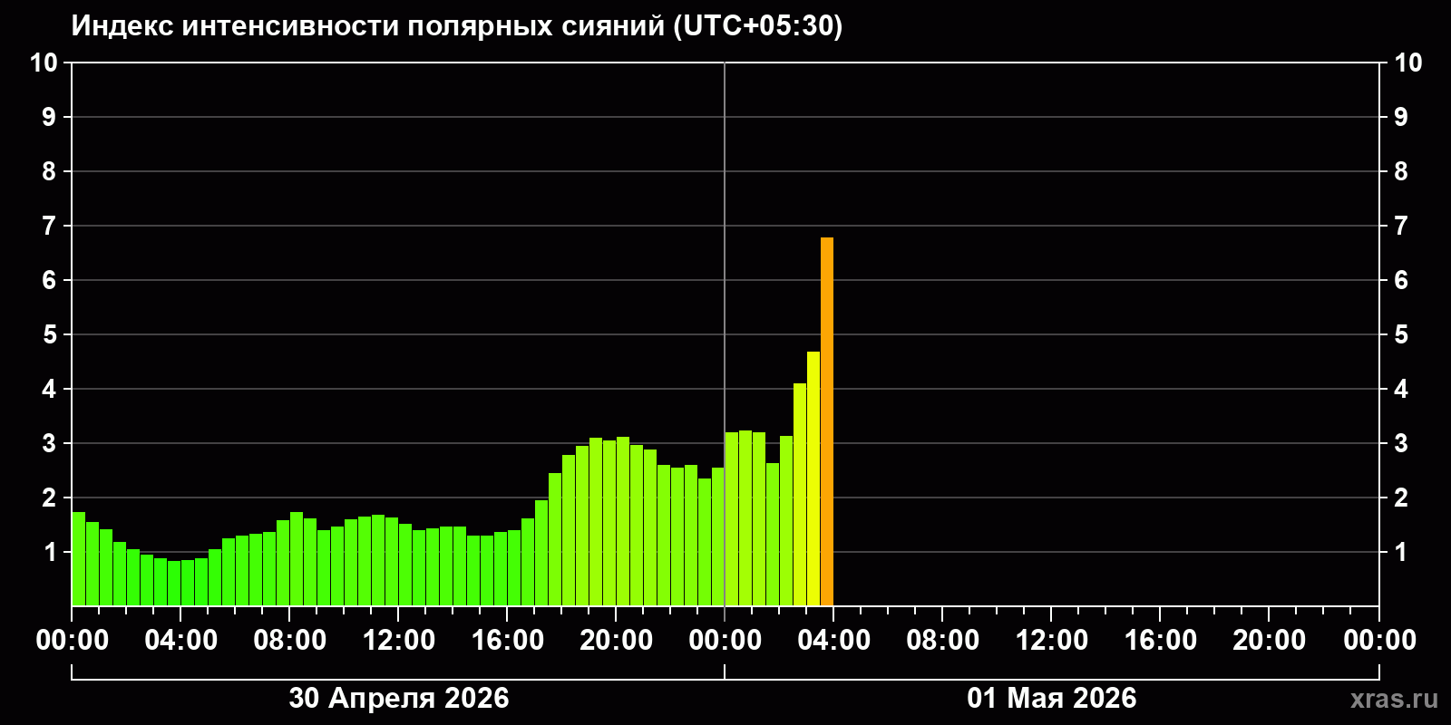 Изменения индекса интенсивности полярных сияний с 2026-04-30 по 2026-05-01 по местному времени