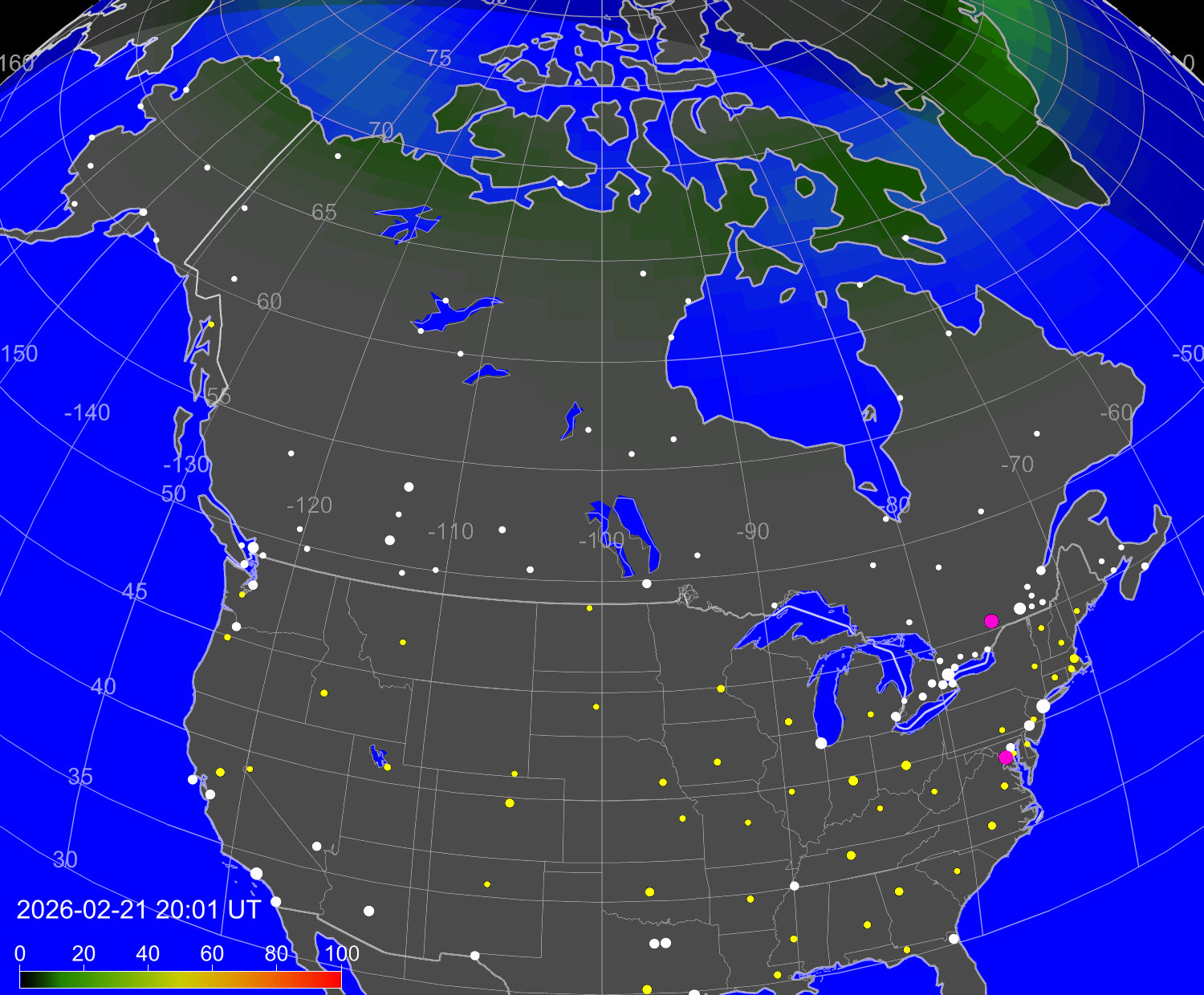 Изменения и часовой прогноз индекса интенсивности полярных сияний с 2026-02-20 по 2026-02-21