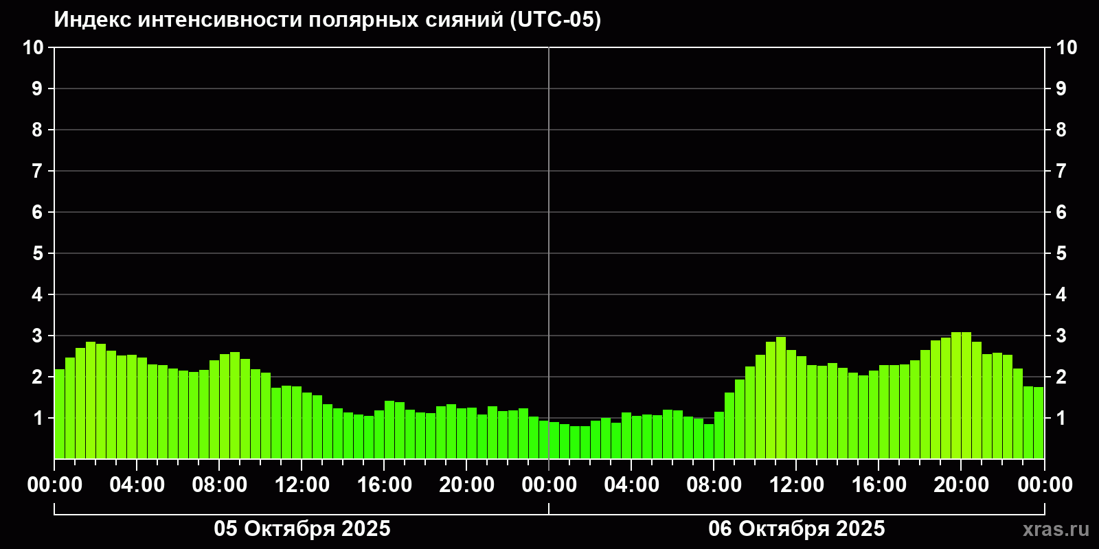 Изменения индекса интенсивности полярных сияний с 2025-10-05 по 2025-10-06 по местному времени