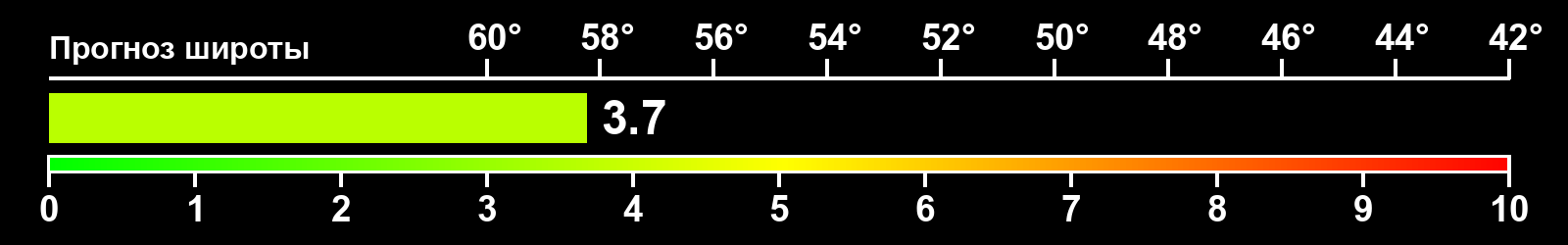 Индекс интенсивности полярных сияний и теоретически возможная широта наблюдений для ночного времени в западном полушарии по состоянию на 2026-03-07 23:52 (конец дня) по местному времени