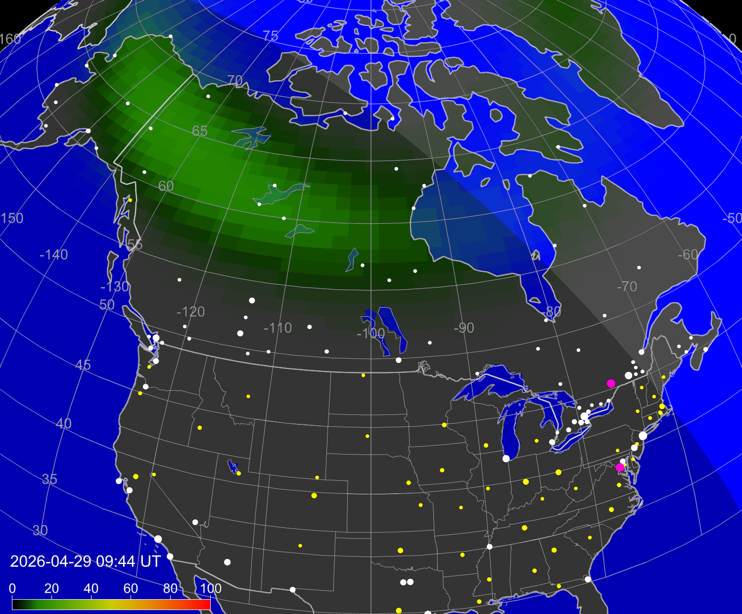 Индекс интенсивности полярных сияний и теоретически возможная широта наблюдений для ночного времени в западном полушарии