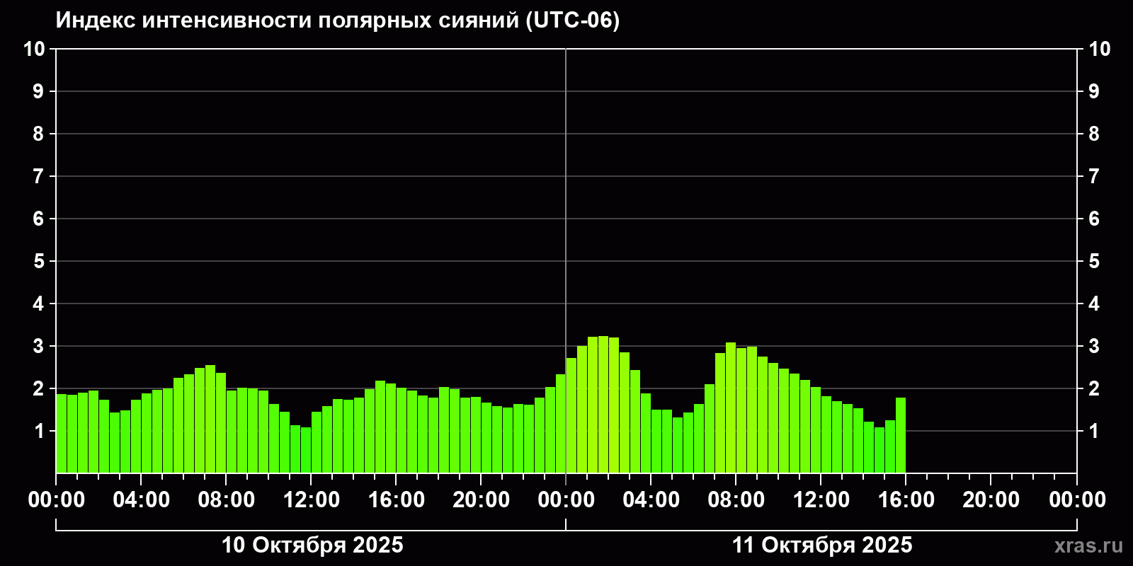 Изменения индекса интенсивности полярных сияний с 2025-10-10 по 2025-10-11 по местному времени