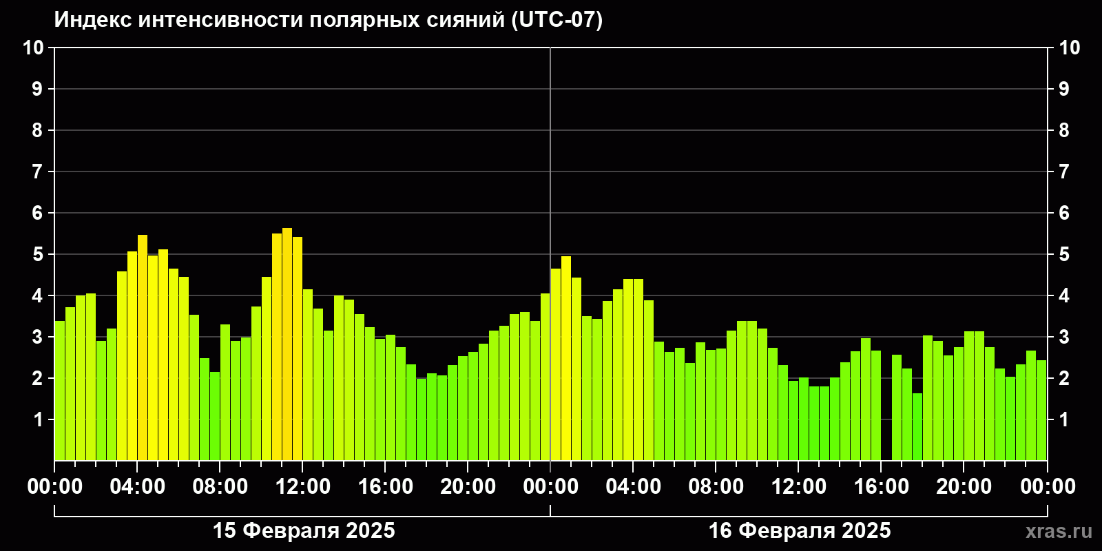 Изменения индекса интенсивности полярных сияний с 2025-02-15 по 2025-02-16 по местному времени
