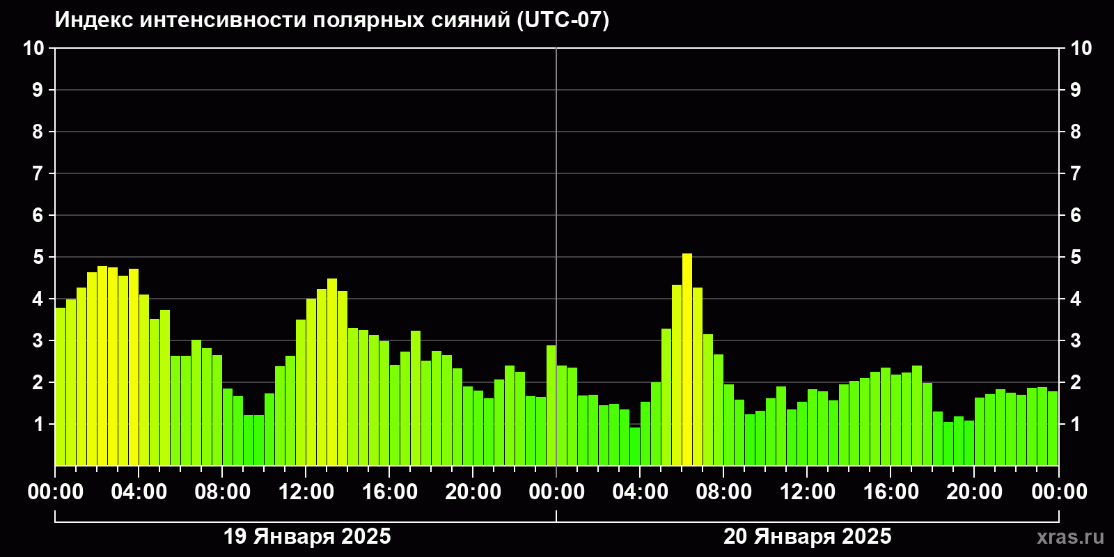 Изменения индекса интенсивности полярных сияний с 2025-01-19 по 2025-01-20 по местному времени