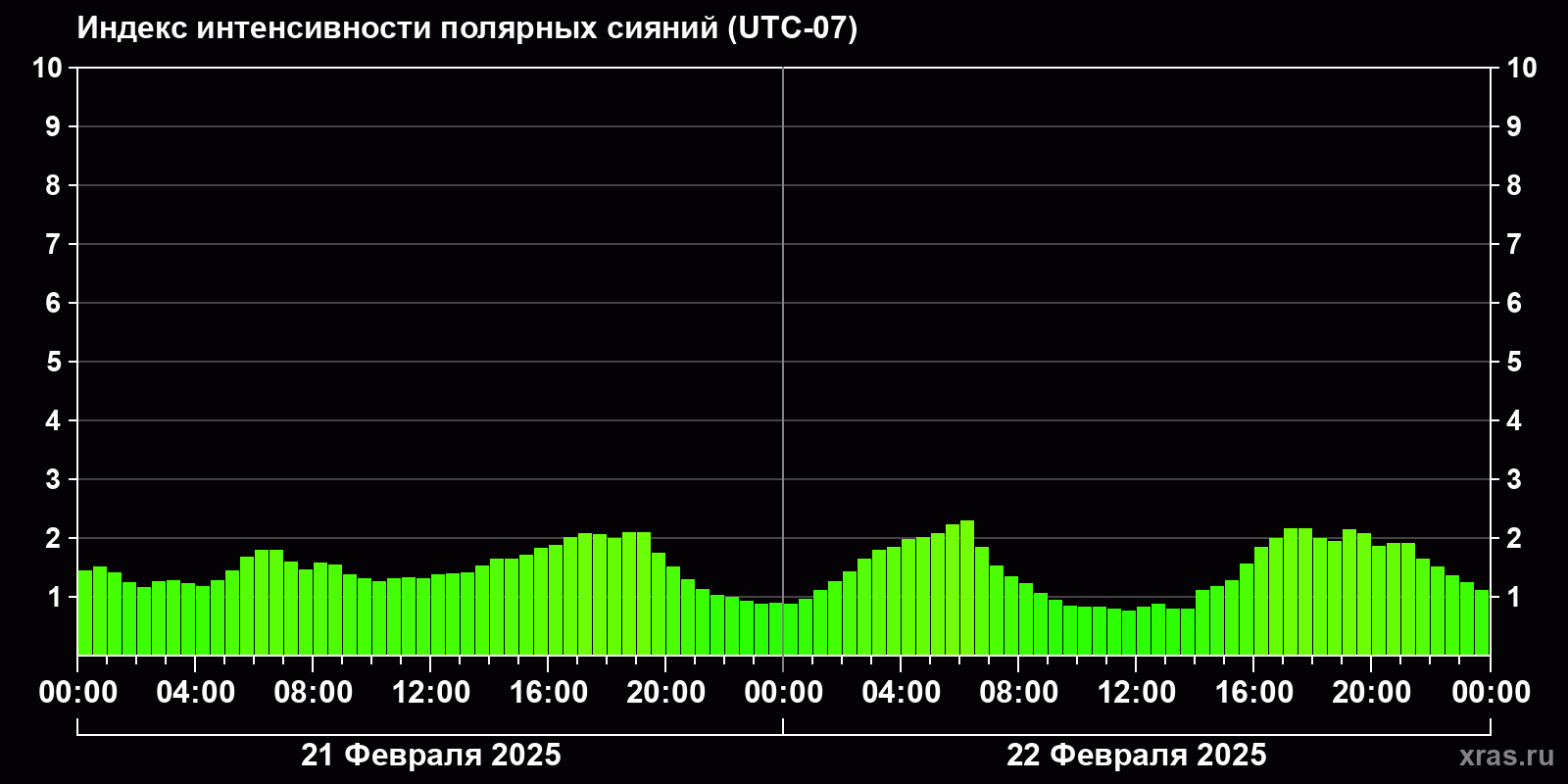Изменения индекса интенсивности полярных сияний с 2025-02-21 по 2025-02-22 по местному времени