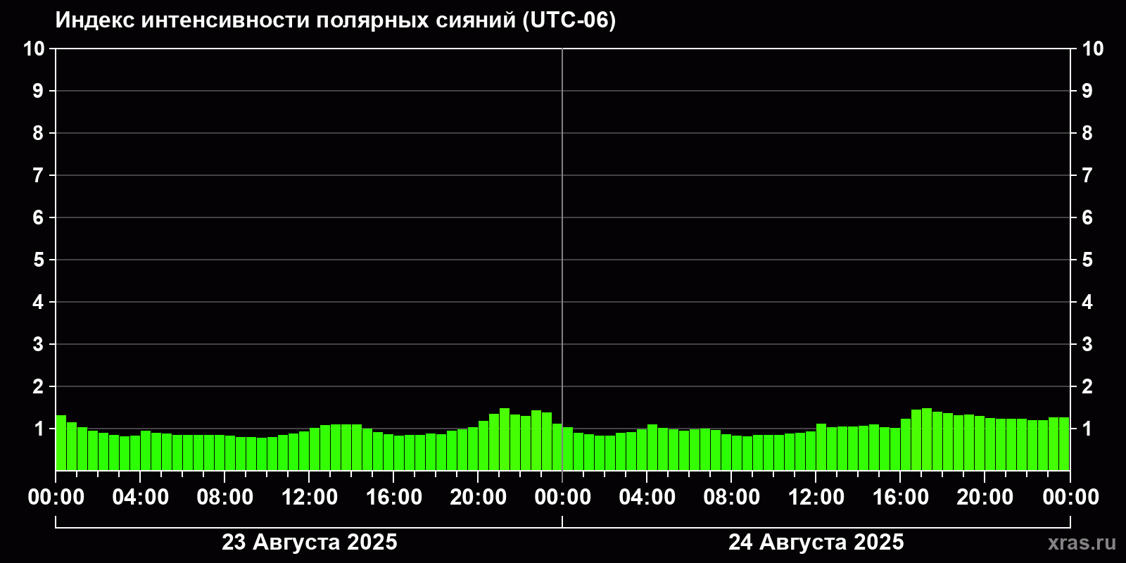 Изменения индекса интенсивности полярных сияний с 2025-08-23 по 2025-08-24 по местному времени