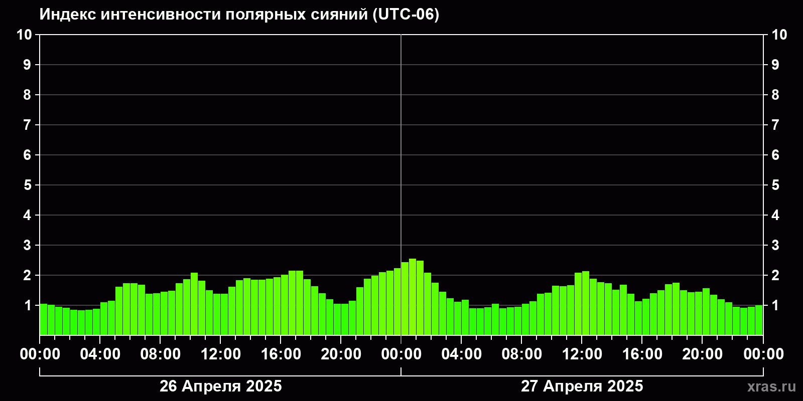 Изменения индекса интенсивности полярных сияний с 2025-04-26 по 2025-04-27 по местному времени