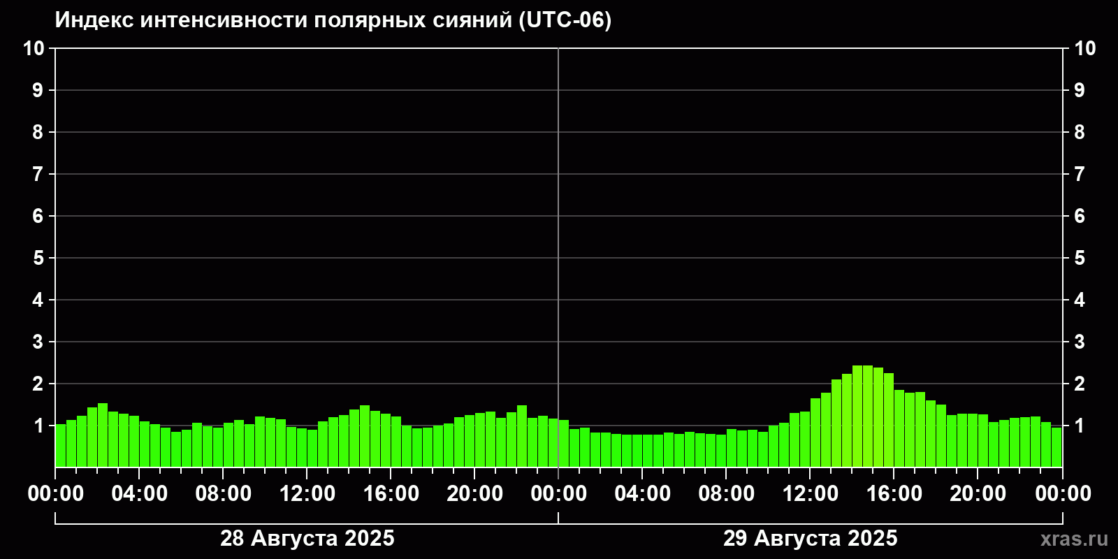 Изменения индекса интенсивности полярных сияний с 2025-08-28 по 2025-08-29 по местному времени