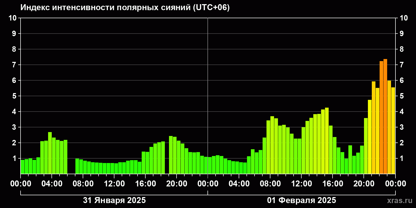 Изменения индекса интенсивности полярных сияний с 2025-01-31 по 2025-02-01 по местному времени