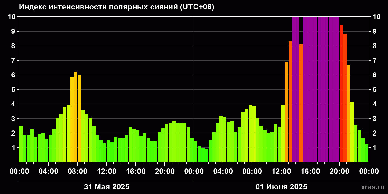Изменения индекса интенсивности полярных сияний с 2025-05-31 по 2025-06-01 по местному времени