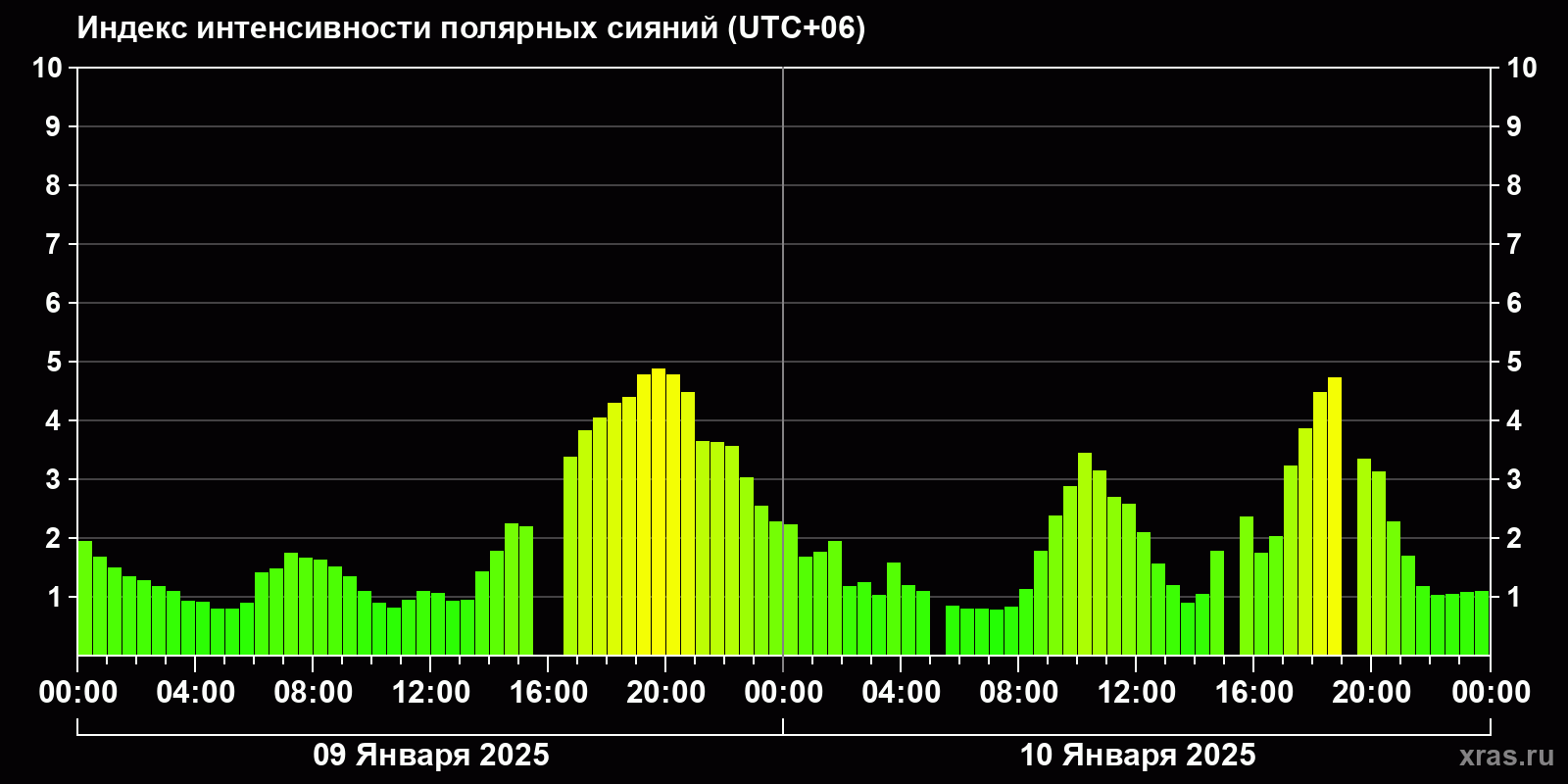 Изменения индекса интенсивности полярных сияний с 2025-01-09 по 2025-01-10 по местному времени