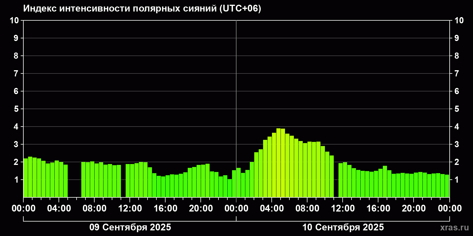 Изменения индекса интенсивности полярных сияний с 2025-09-09 по 2025-09-10 по местному времени
