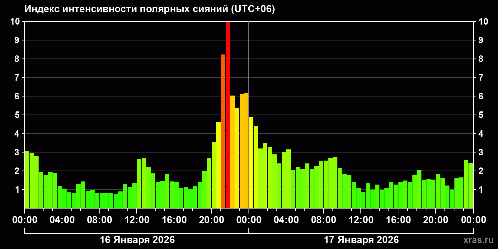 Изменения индекса интенсивности полярных сияний с 2026-01-16 по 2026-01-17 по местному времени