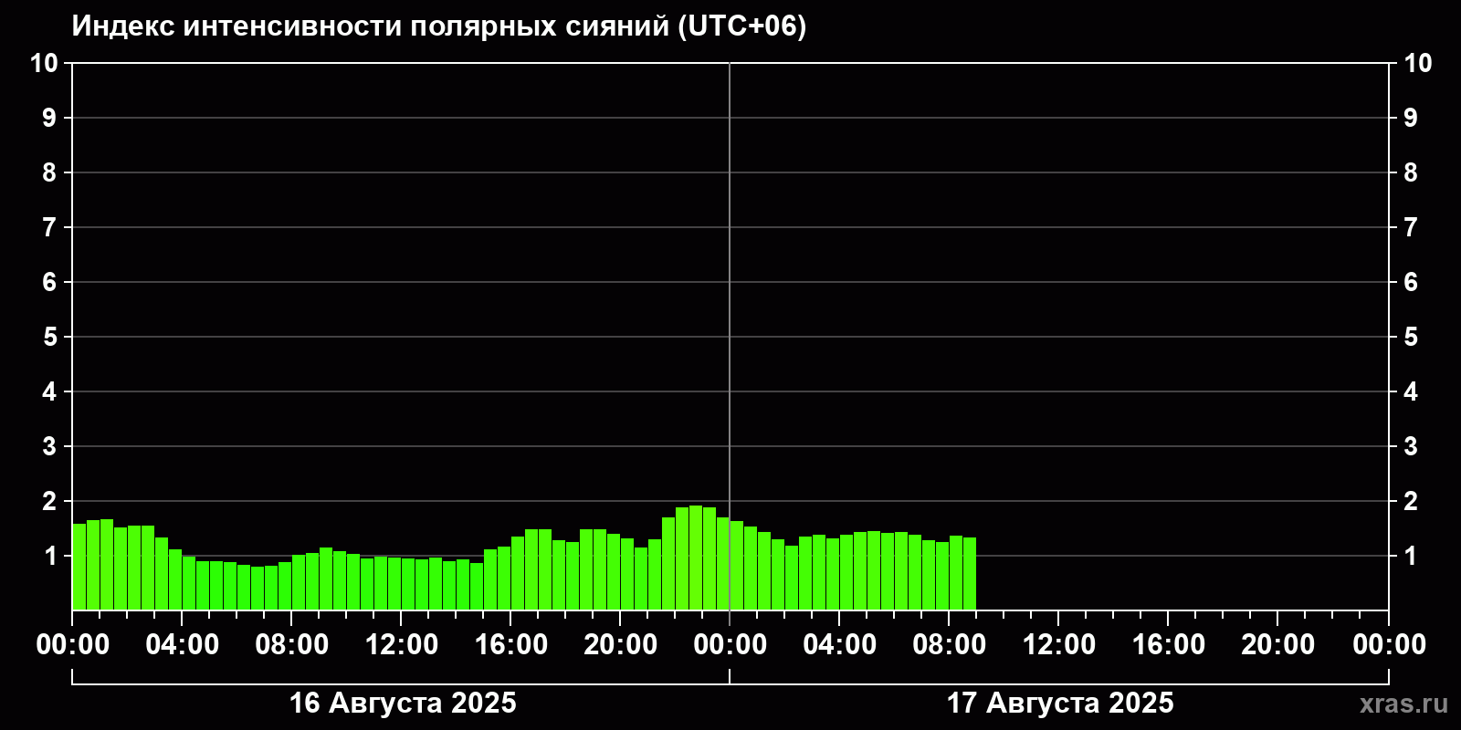 Изменения индекса интенсивности полярных сияний с 2025-08-16 по 2025-08-17 по местному времени