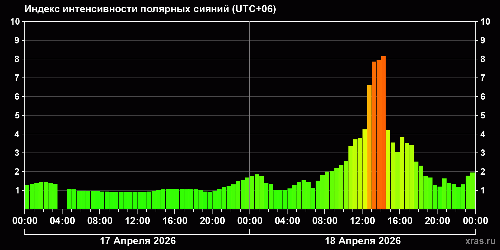 Изменения индекса интенсивности полярных сияний с 2026-04-17 по 2026-04-18 по местному времени