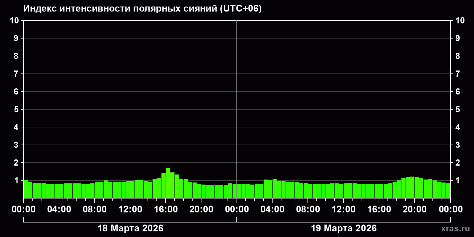 Изменения индекса интенсивности полярных сияний с 2026-03-18 по 2026-03-19 по местному времени