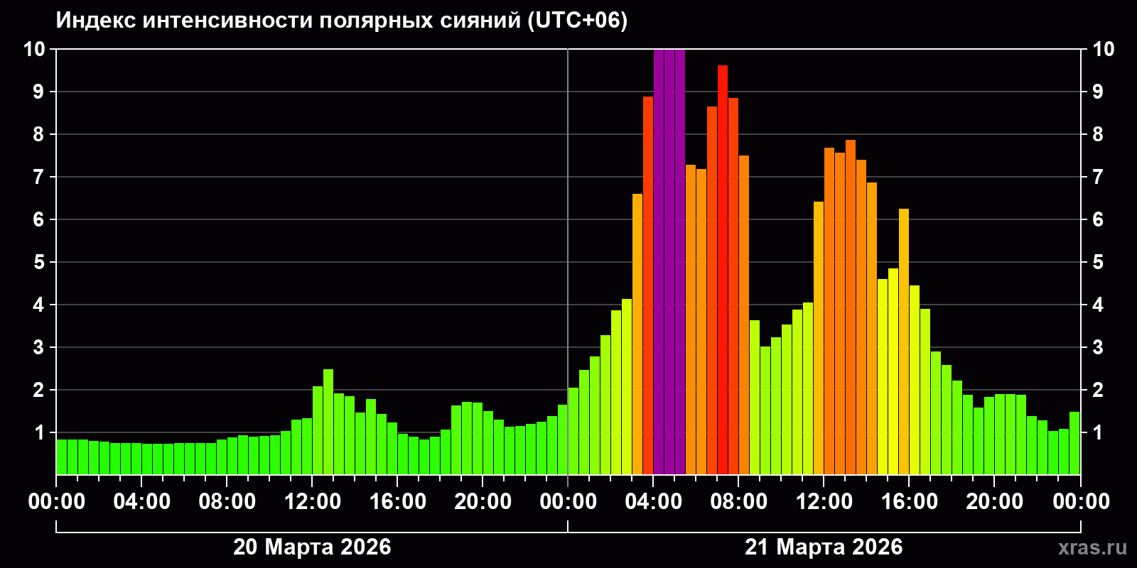 Изменения индекса интенсивности полярных сияний с 2026-03-20 по 2026-03-21 по местному времени