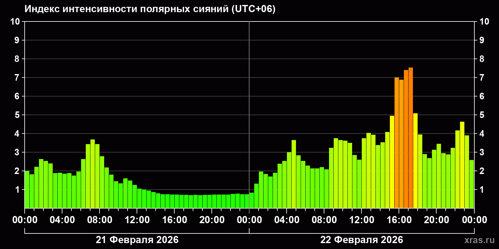 Изменения индекса интенсивности полярных сияний с 2026-02-21 по 2026-02-22 по местному времени