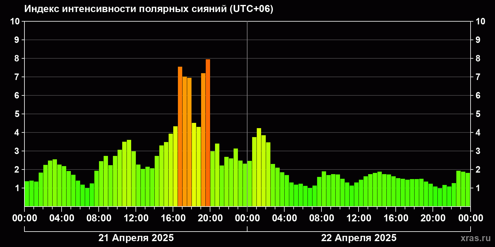 Изменения индекса интенсивности полярных сияний с 2025-04-21 по 2025-04-22 по местному времени
