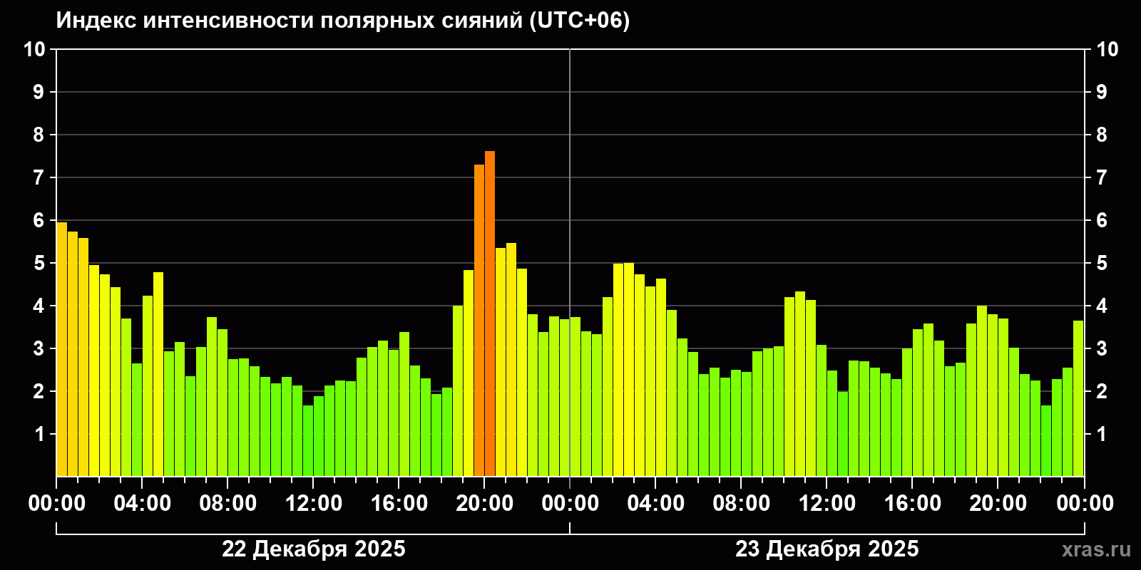 Изменения индекса интенсивности полярных сияний с 2025-12-22 по 2025-12-23 по местному времени