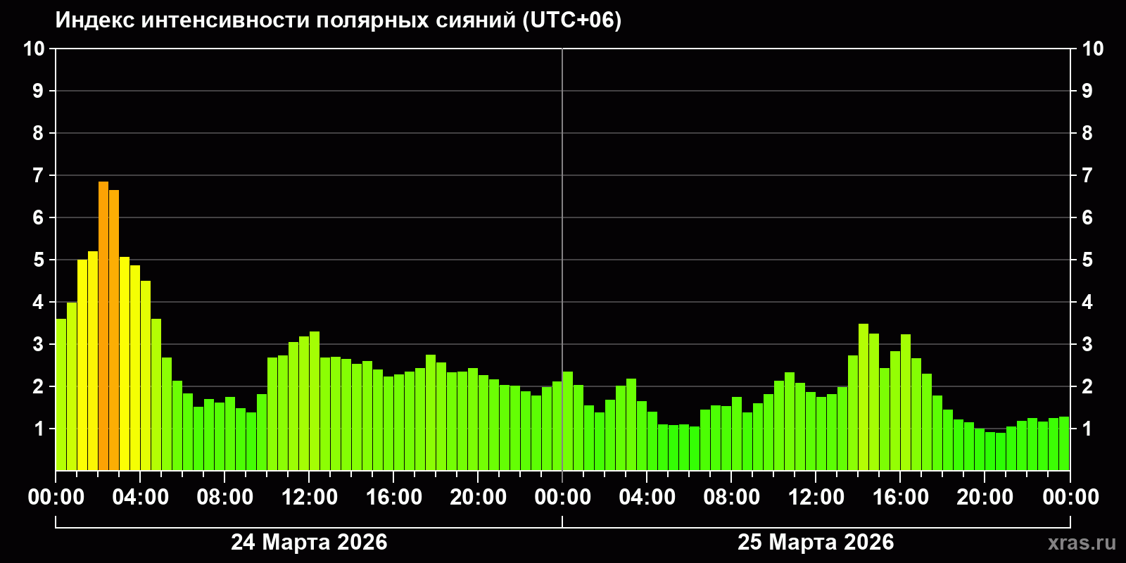 Изменения индекса интенсивности полярных сияний с 2026-03-24 по 2026-03-25 по местному времени