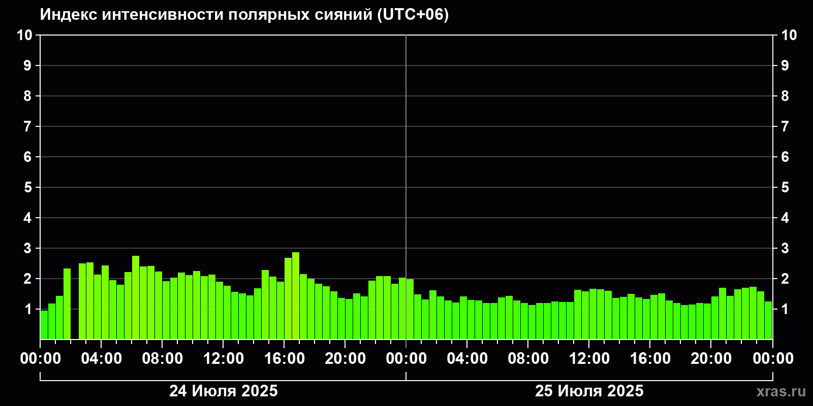 Изменения индекса интенсивности полярных сияний с 2025-07-24 по 2025-07-25 по местному времени