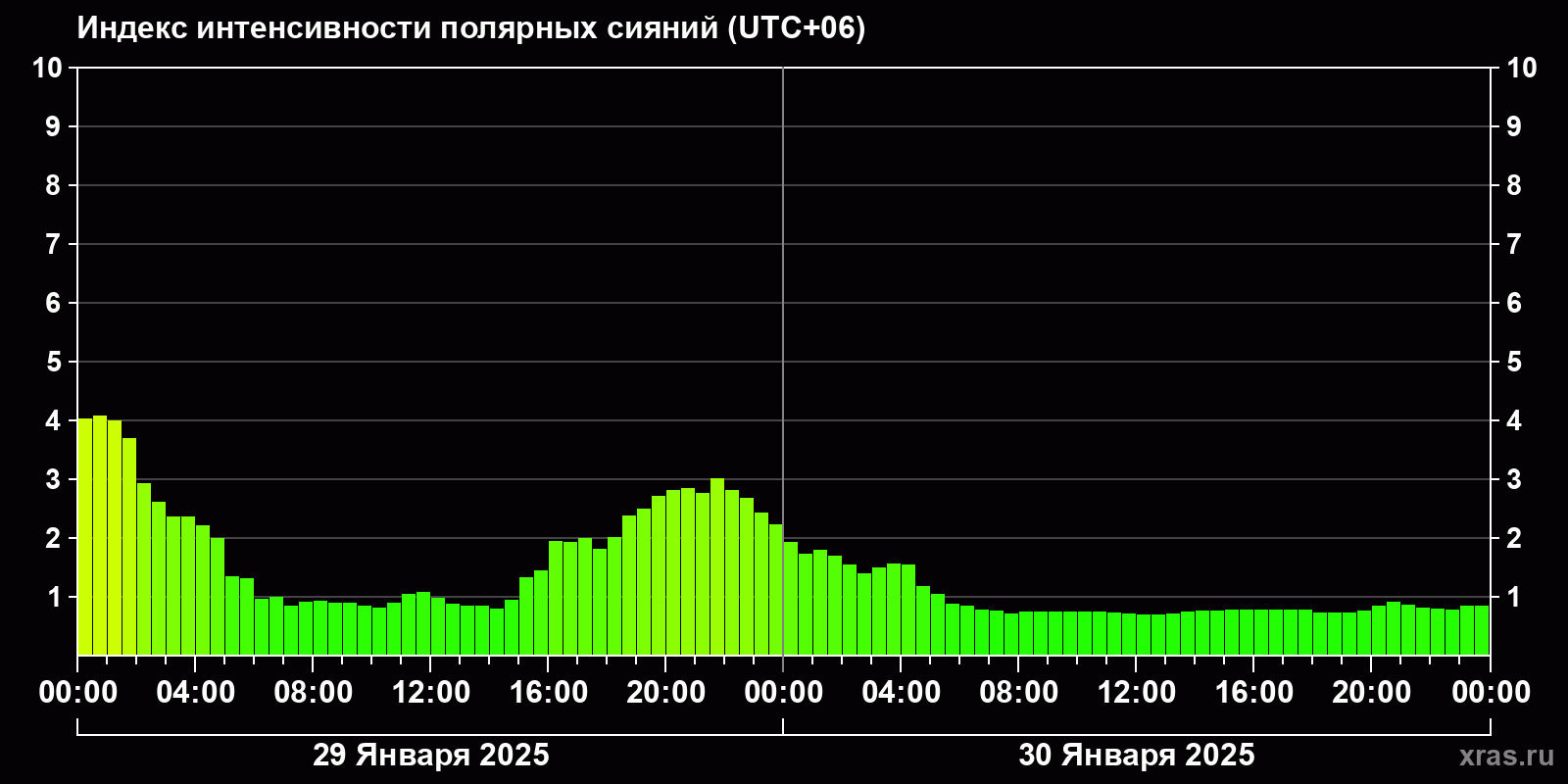 Изменения индекса интенсивности полярных сияний с 2025-01-29 по 2025-01-30 по местному времени