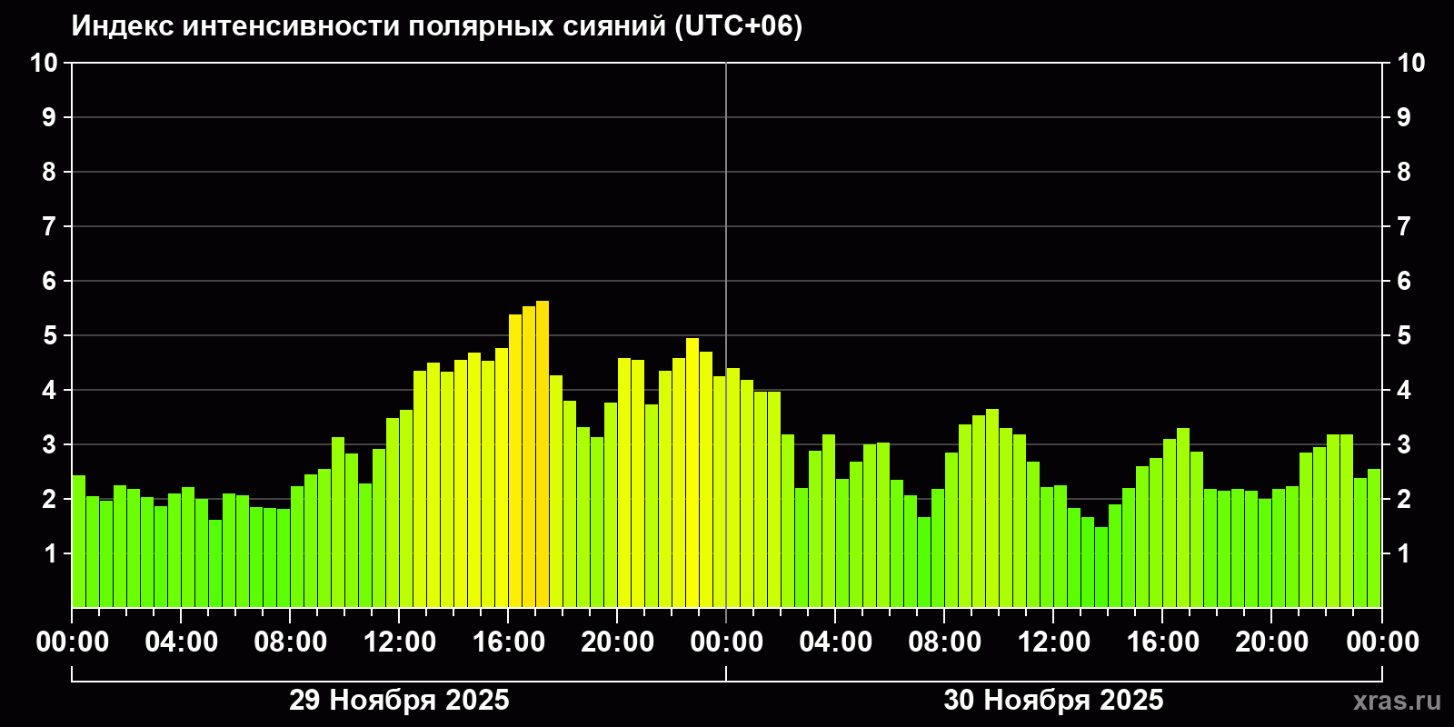 Изменения индекса интенсивности полярных сияний с 2025-11-29 по 2025-11-30 по местному времени