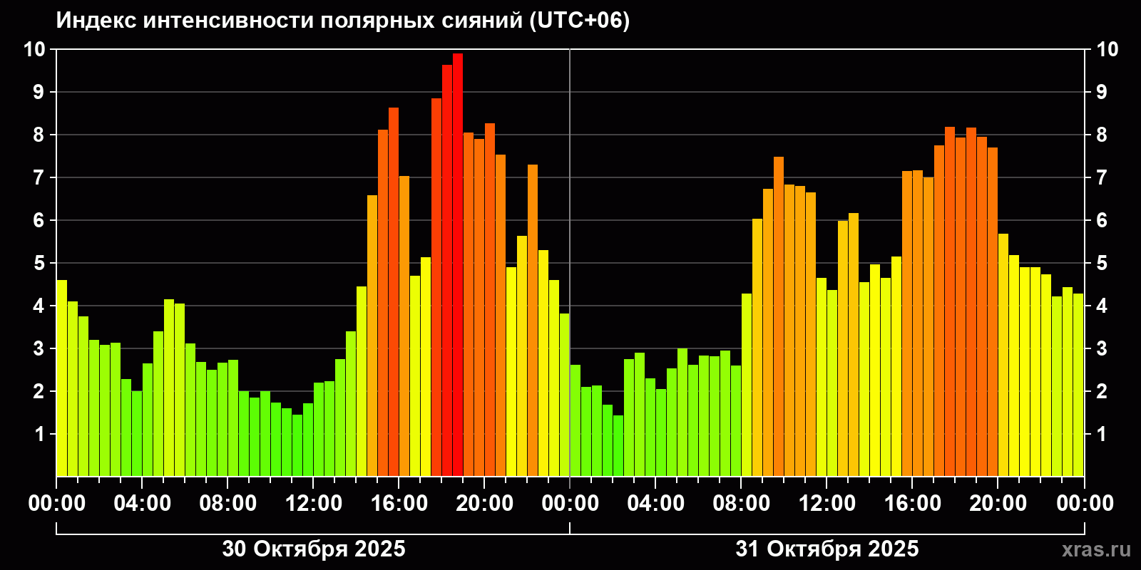 Изменения индекса интенсивности полярных сияний с 2025-10-30 по 2025-10-31 по местному времени