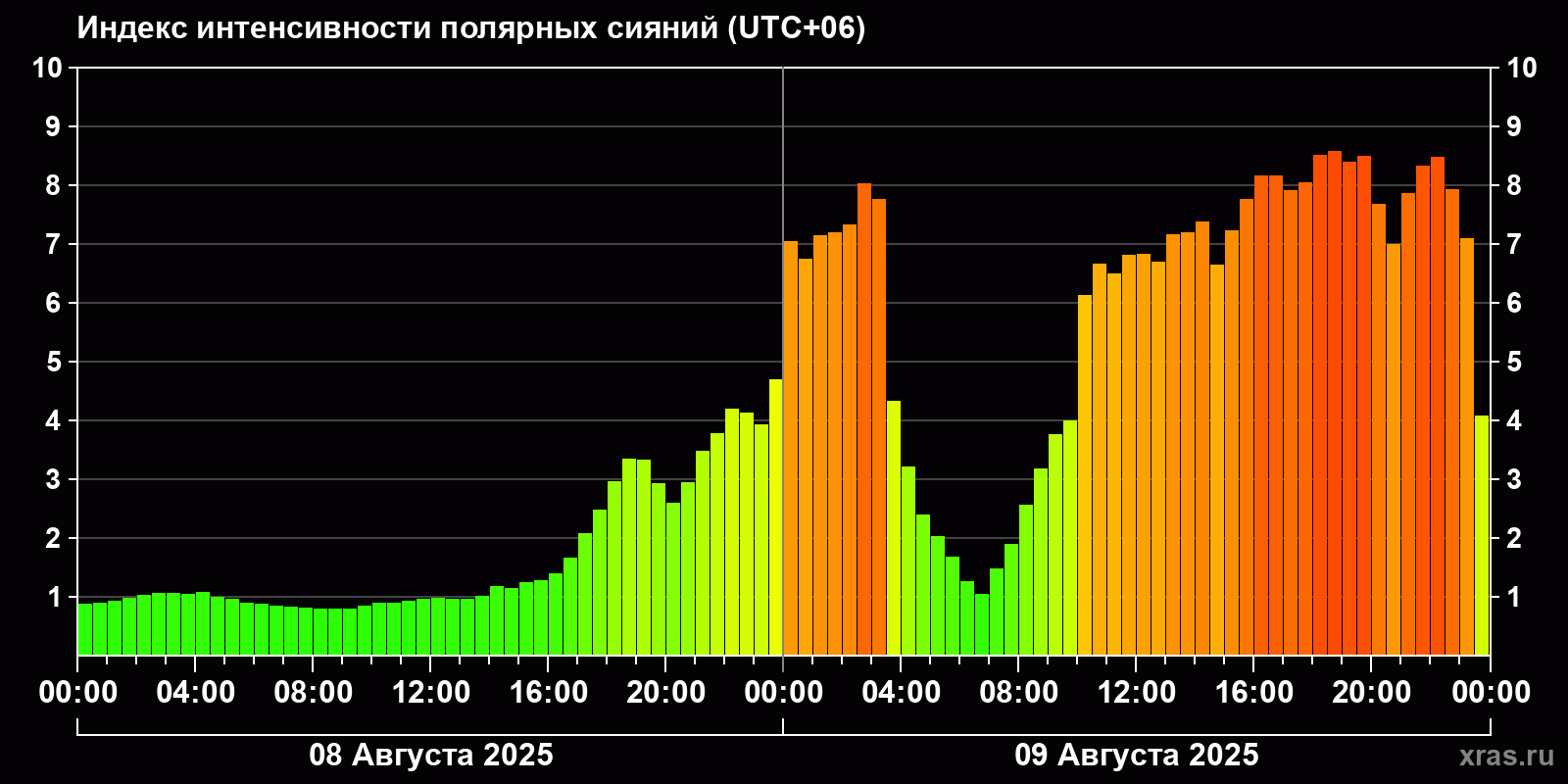 Изменения индекса интенсивности полярных сияний с 2025-08-08 по 2025-08-09 по местному времени