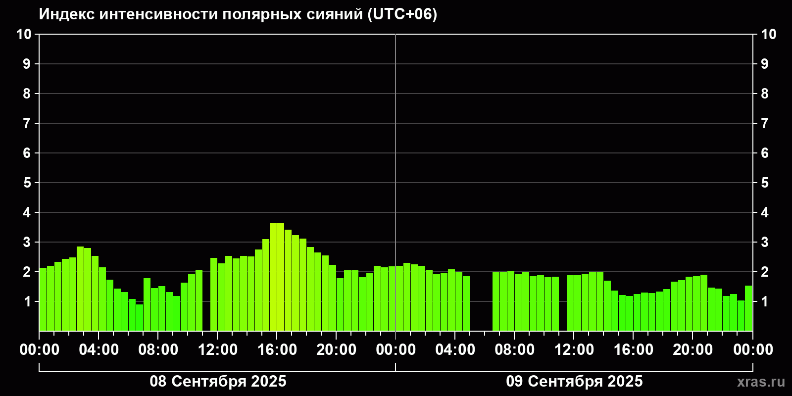 Изменения индекса интенсивности полярных сияний с 2025-09-08 по 2025-09-09 по местному времени