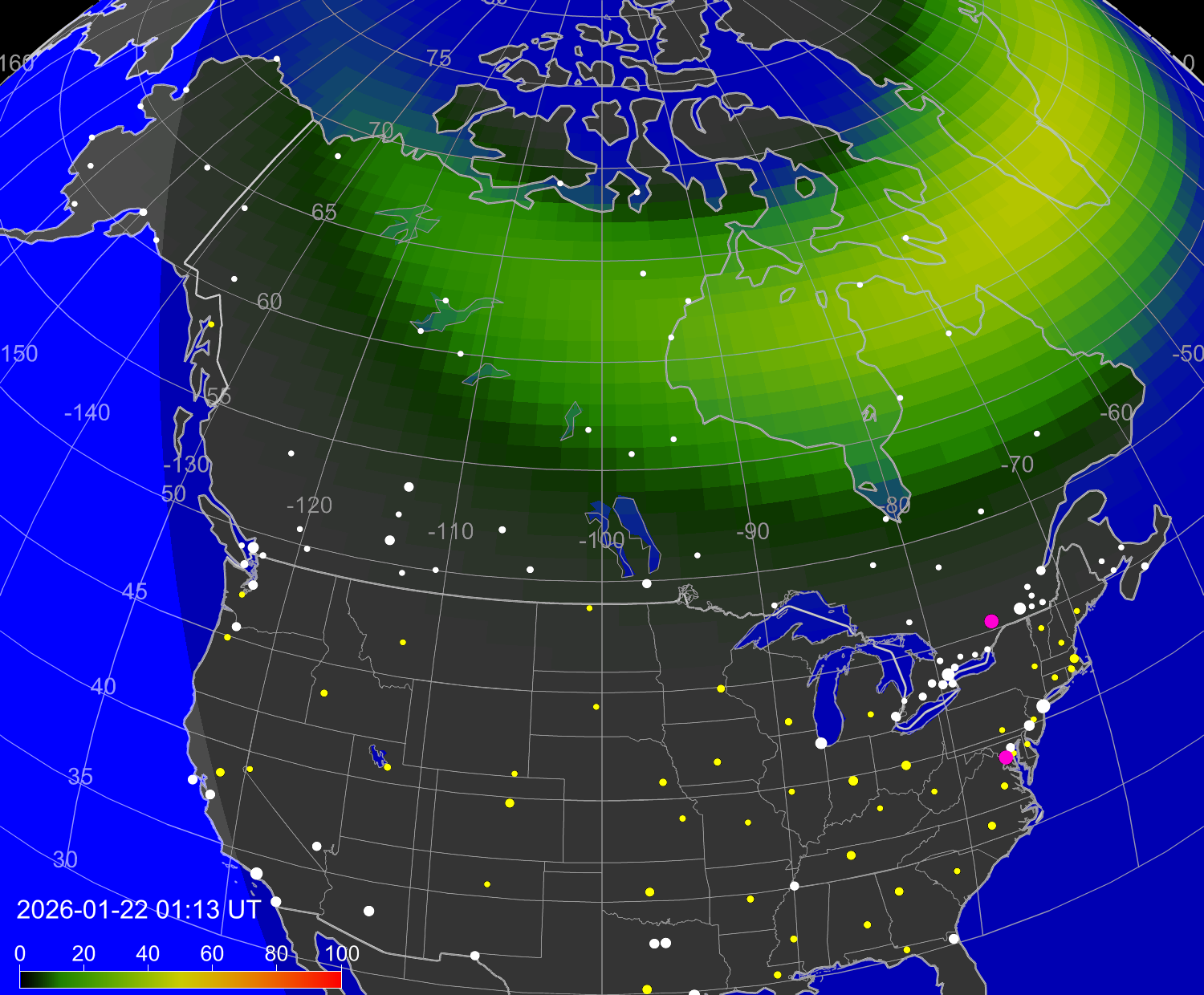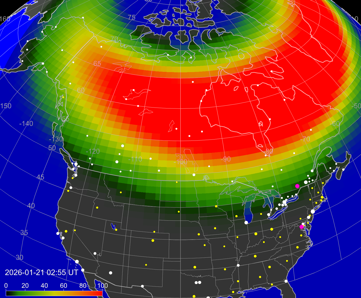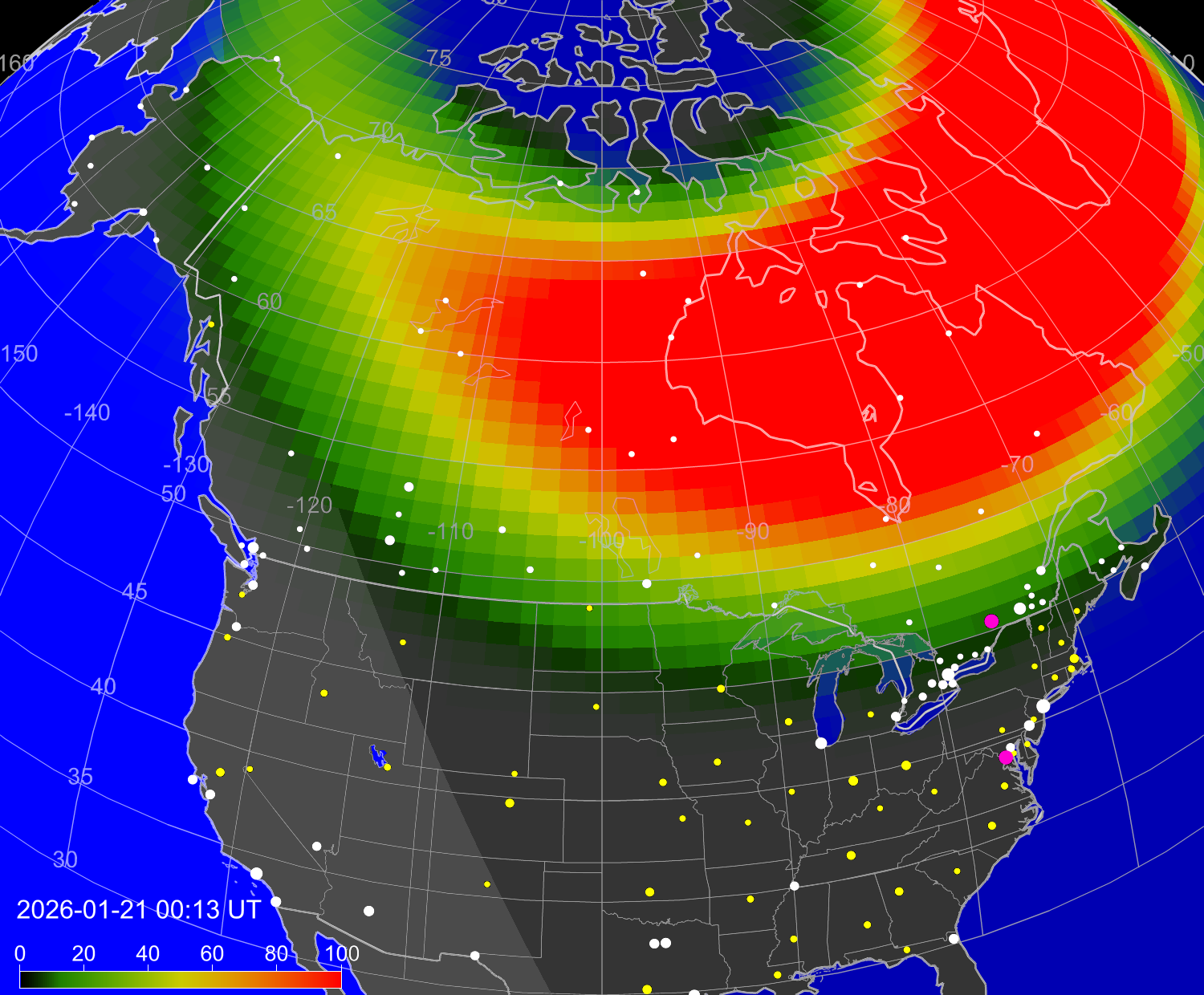 Вероятность полярных сияний в городах Канады
