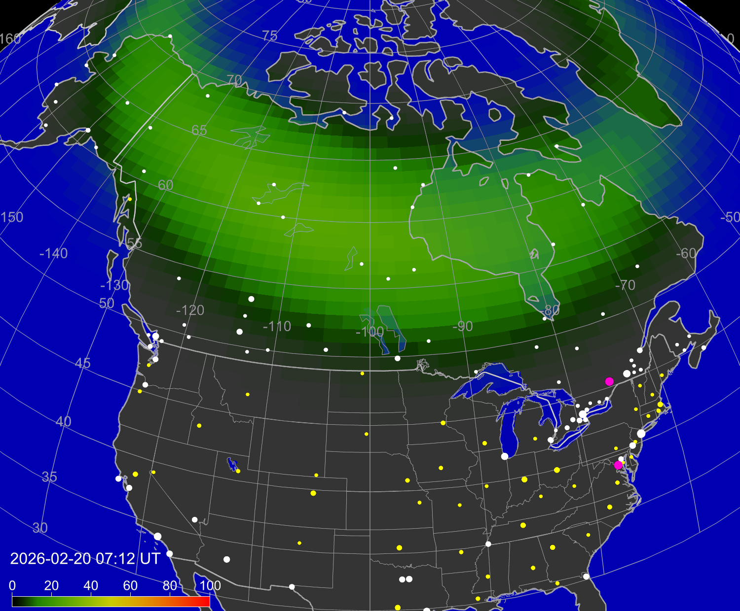 Изменения и часовой прогноз индекса интенсивности полярных сияний с 2026-02-19 по 2026-02-20