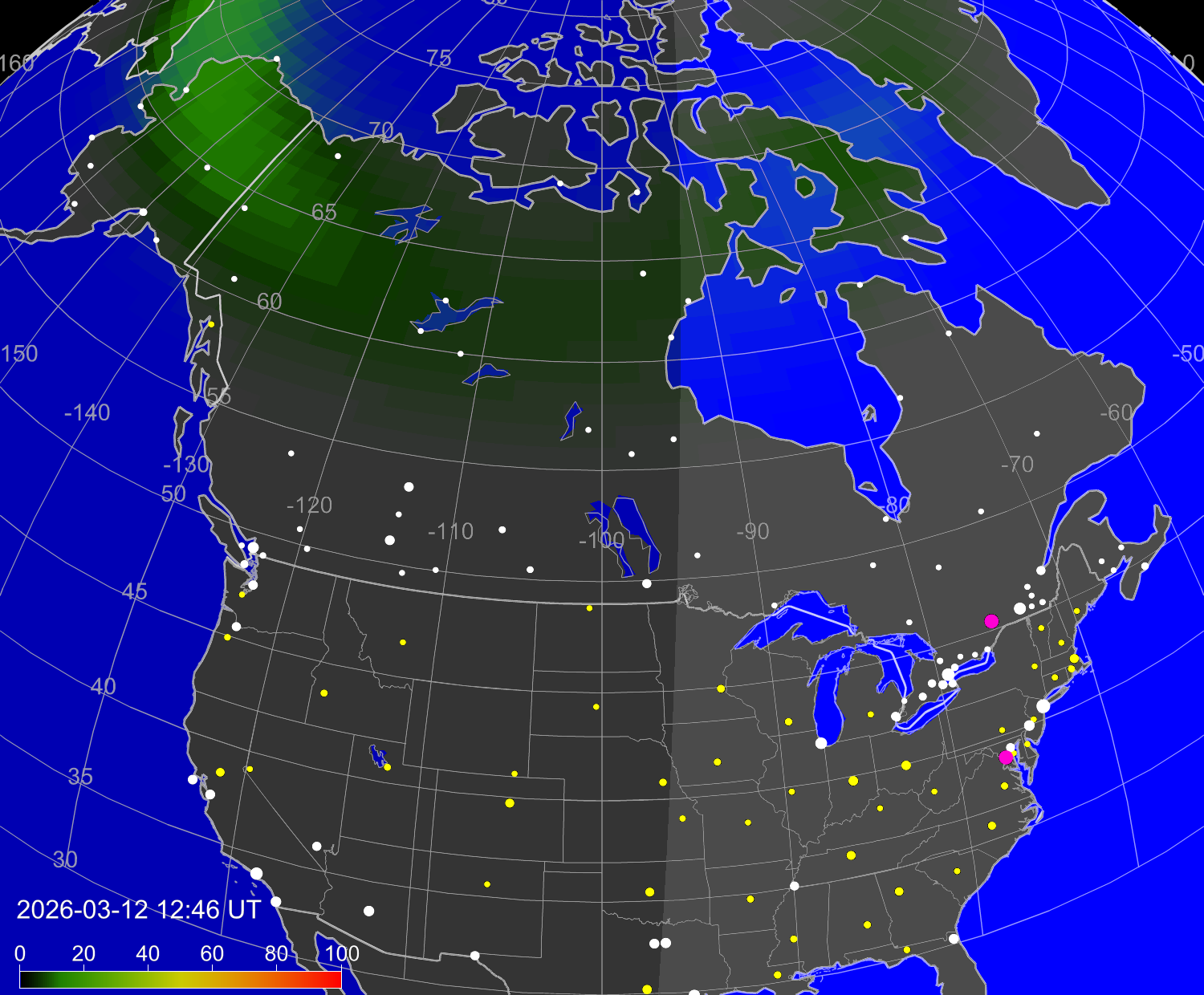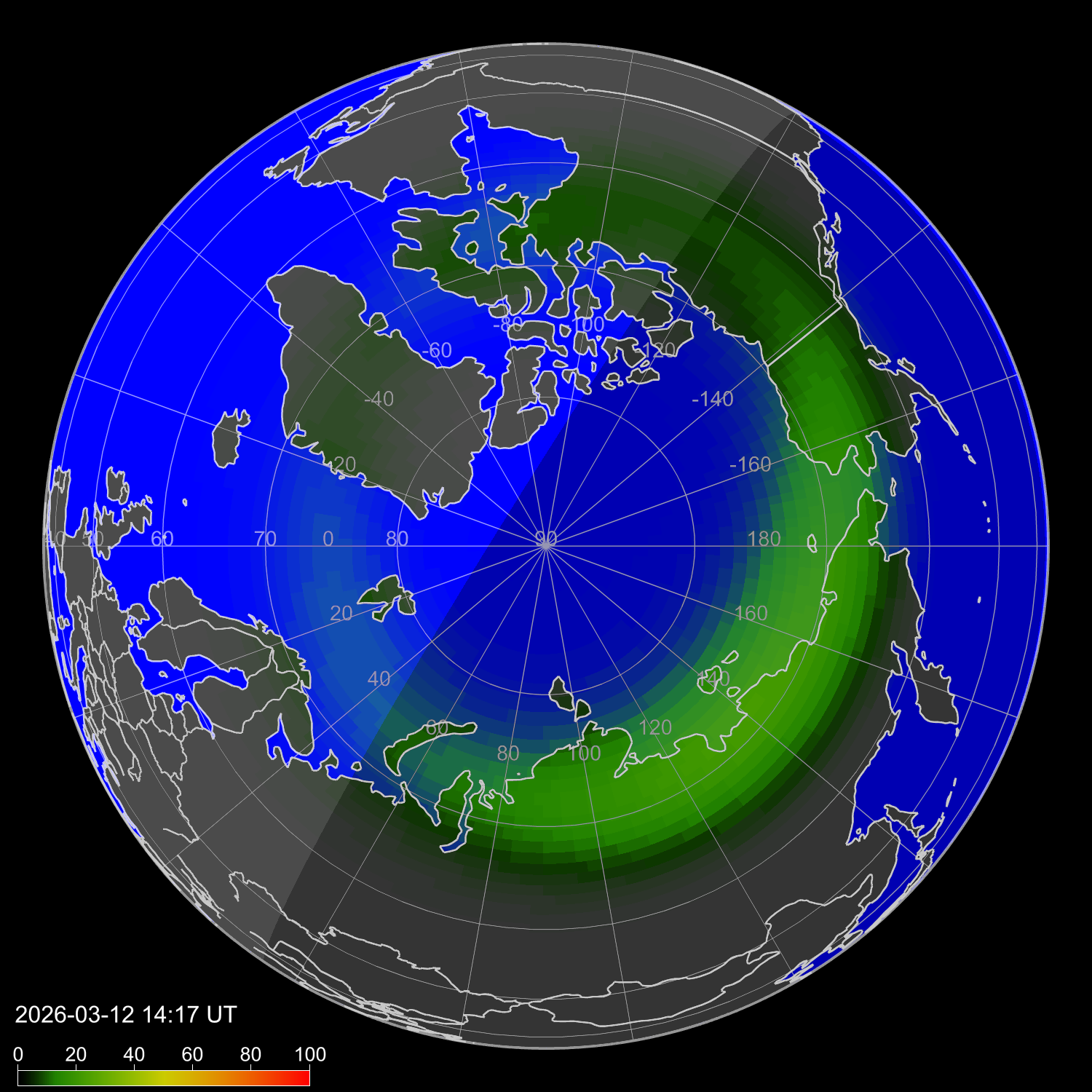 Индекс интенсивности полярных сияний и теоретически возможная широта наблюдений для ночного времени в западном полушарии