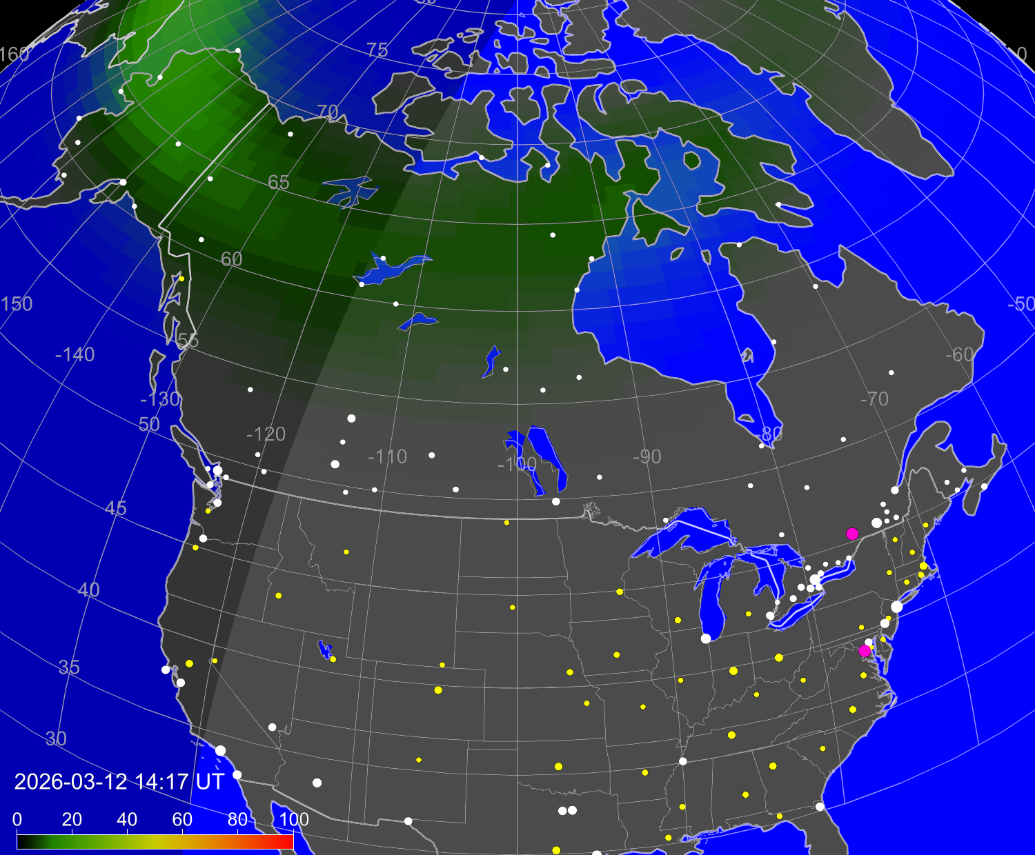 Вероятность полярных сияний в городах Канады