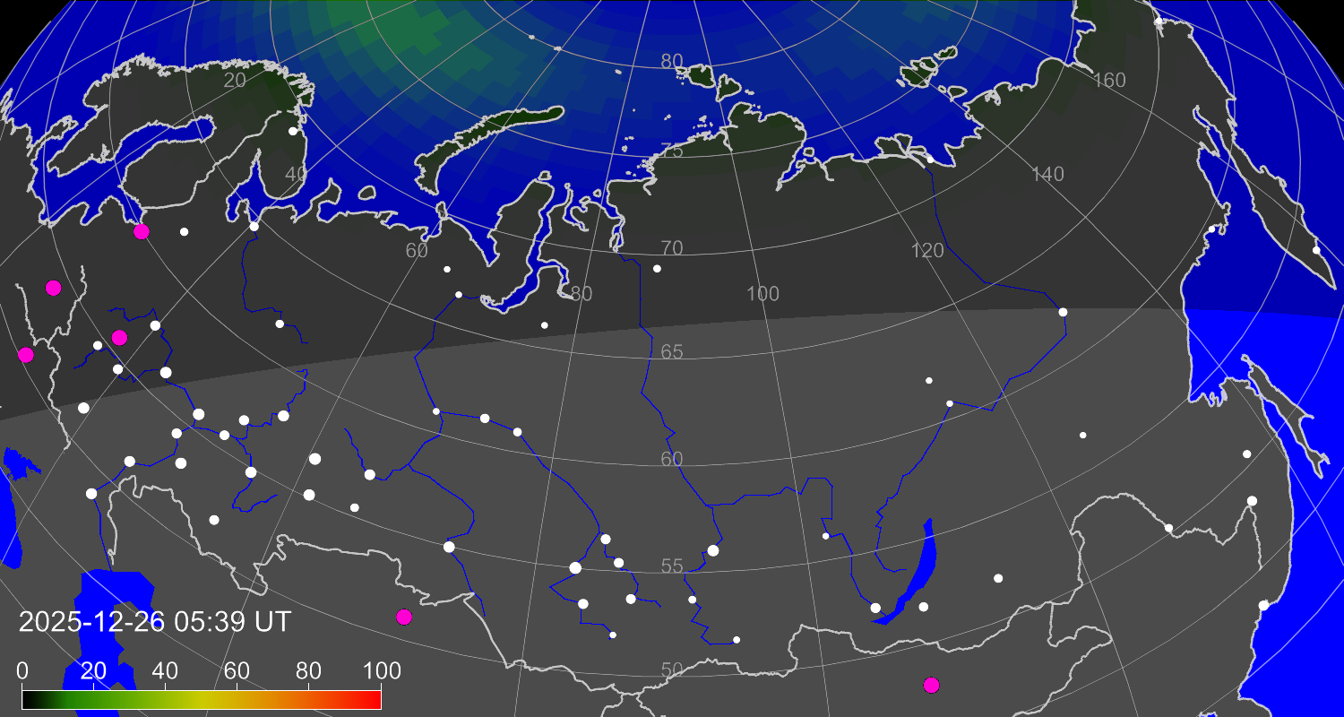 Индекс интенсивности полярных сияний и теоретически возможная широта наблюдений для ночного времени в восточном полушарии