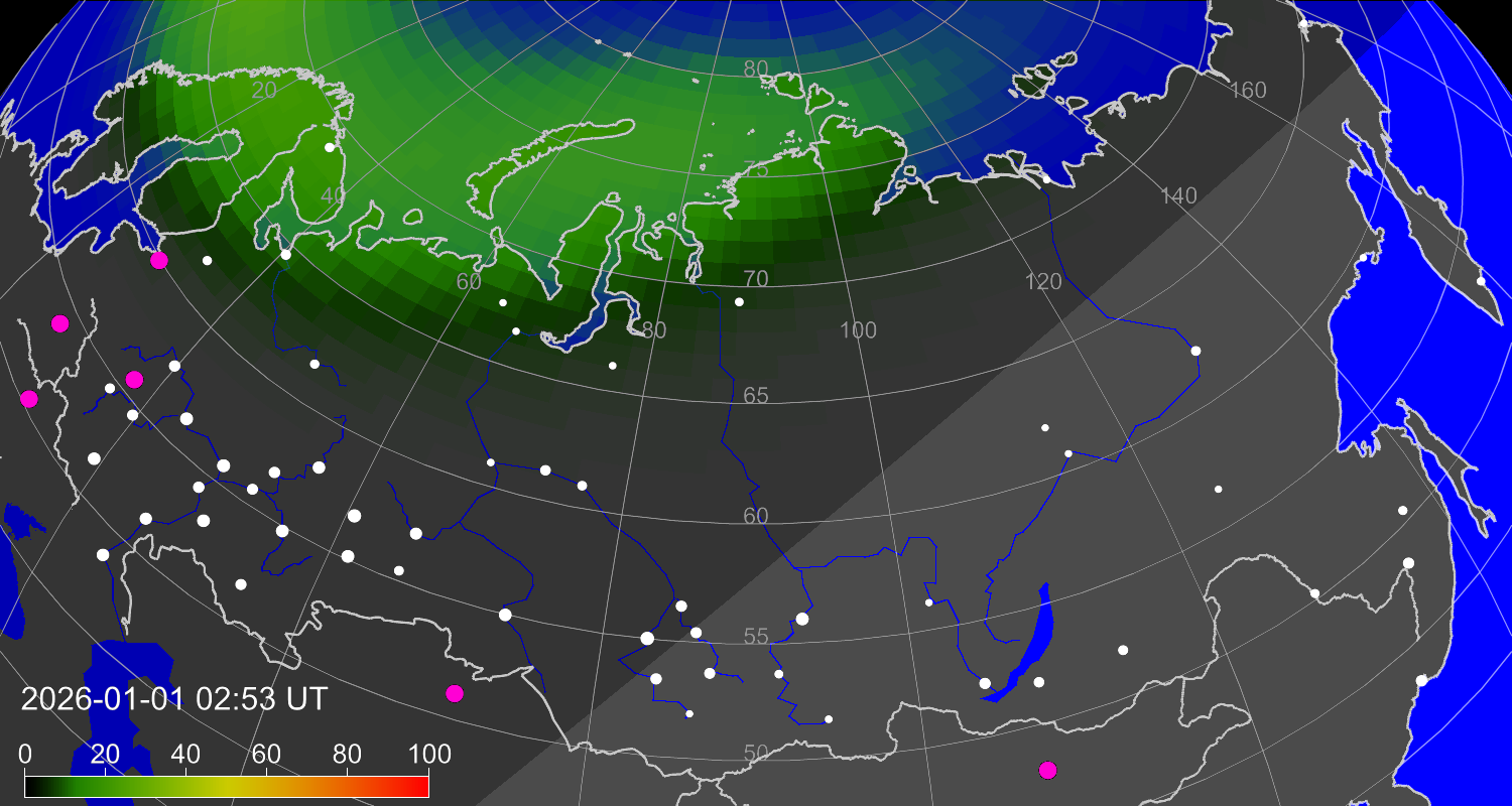 Изменения и часовой прогноз индекса интенсивности полярных сияний с 2025-12-31 по 2026-01-01